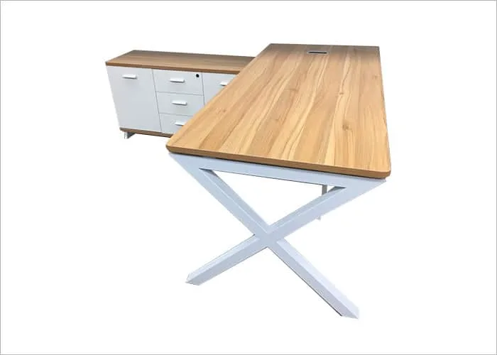 שולחן עובדים בעיצוב ארכיטקטוני פורץ דרך. גולת הכותרת של הדגם היא רגלי המתכת המעוצבות בצורת "X" בגימור לבן מט, המעניקות לשולחן יציבות מקסימלית לצד מראה קליל ומודרני. השולחן משלב משטח עבודה עבה בטקסטורת עץ טבעי עם שלוחה צדדית רחבה הכוללת פתרונות אחסון מתקדמים (מגירות וארונית), ליצירת סביבת עבודה יוקרתית ומאורגנת להפליא.