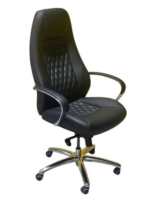 תיפורי פרימיום: ריפוד עור תעשייתי (Eco-Leather) איכותי ונושם, הכולל תיפורי רוחב דקורטיביים המעניקים לכיסא מראה סמכותי ומודרני.