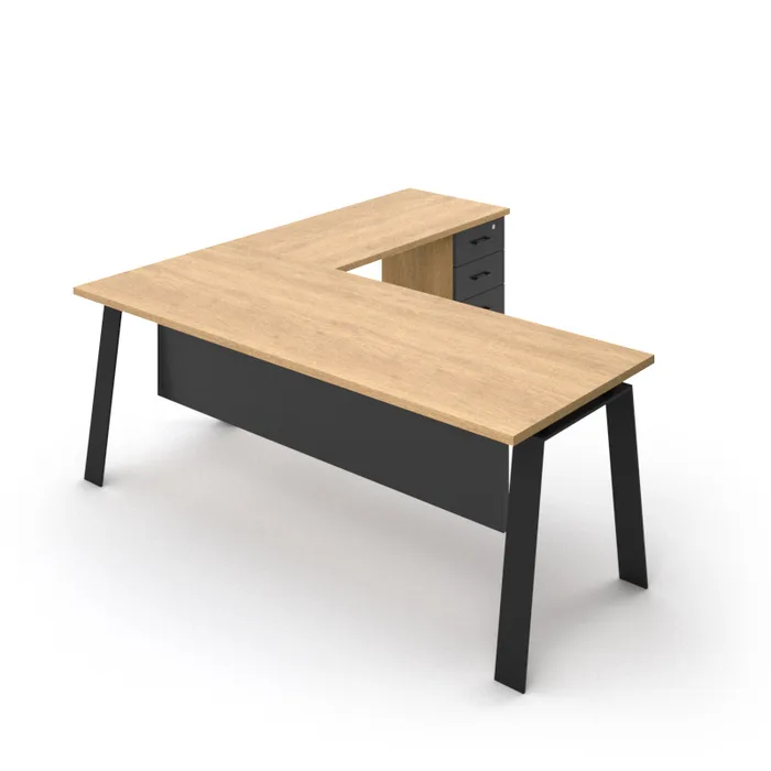 עמדת עבודה פינתית לעובדים המשלבת עיצוב Industrial Modern עם פונקציונליות מקסימלית. השולחן מתאפיין ברגלי מתכת שחורות בזווית אלכסונית המעניקות לחלל המשרד מראה דינמי, פתוח ומודרני. פתרון אידיאלי לעובדים הזקוקים למרחב עבודה רחב (לשימוש בשני מסכים) יחד עם פתרון אחסון נגיש. השילוב בין רגלי הברזל למשטח העץ הבהיר יוצר סביבת עבודה נעימה המעודדת יצירתיות ופרודוקטיביות.